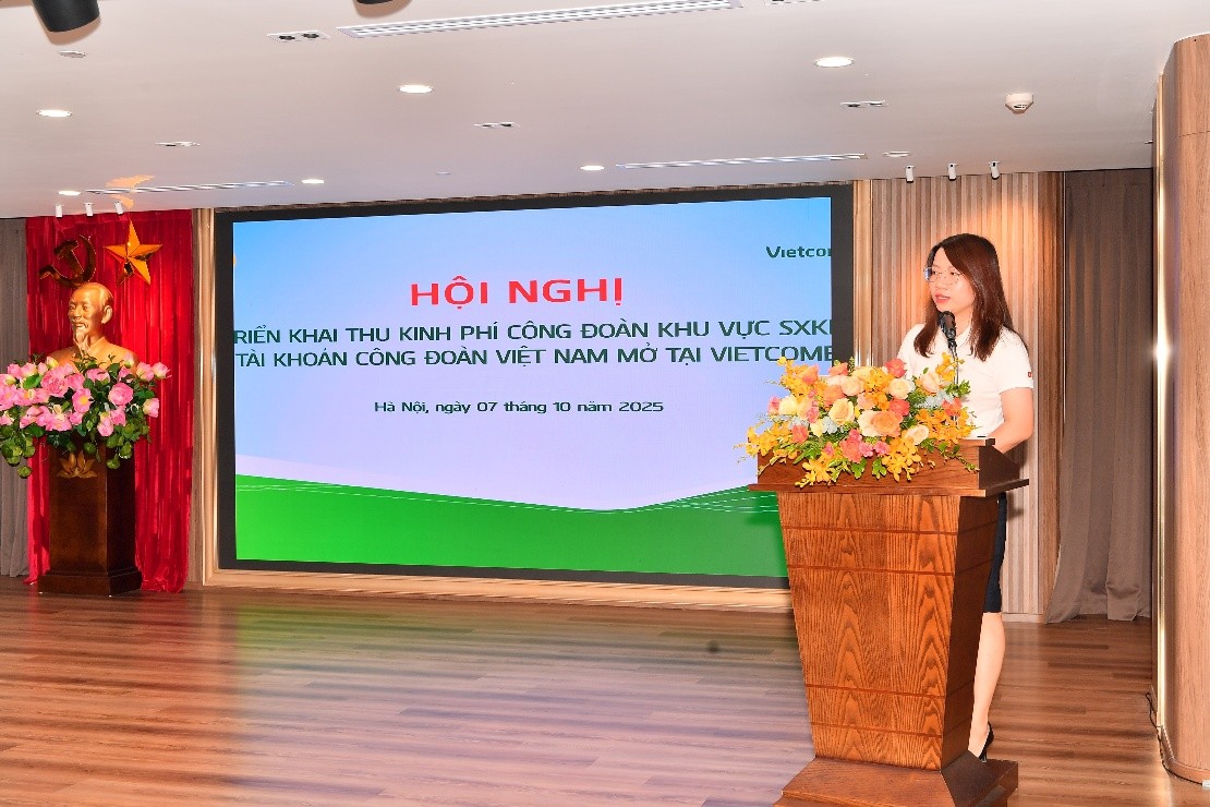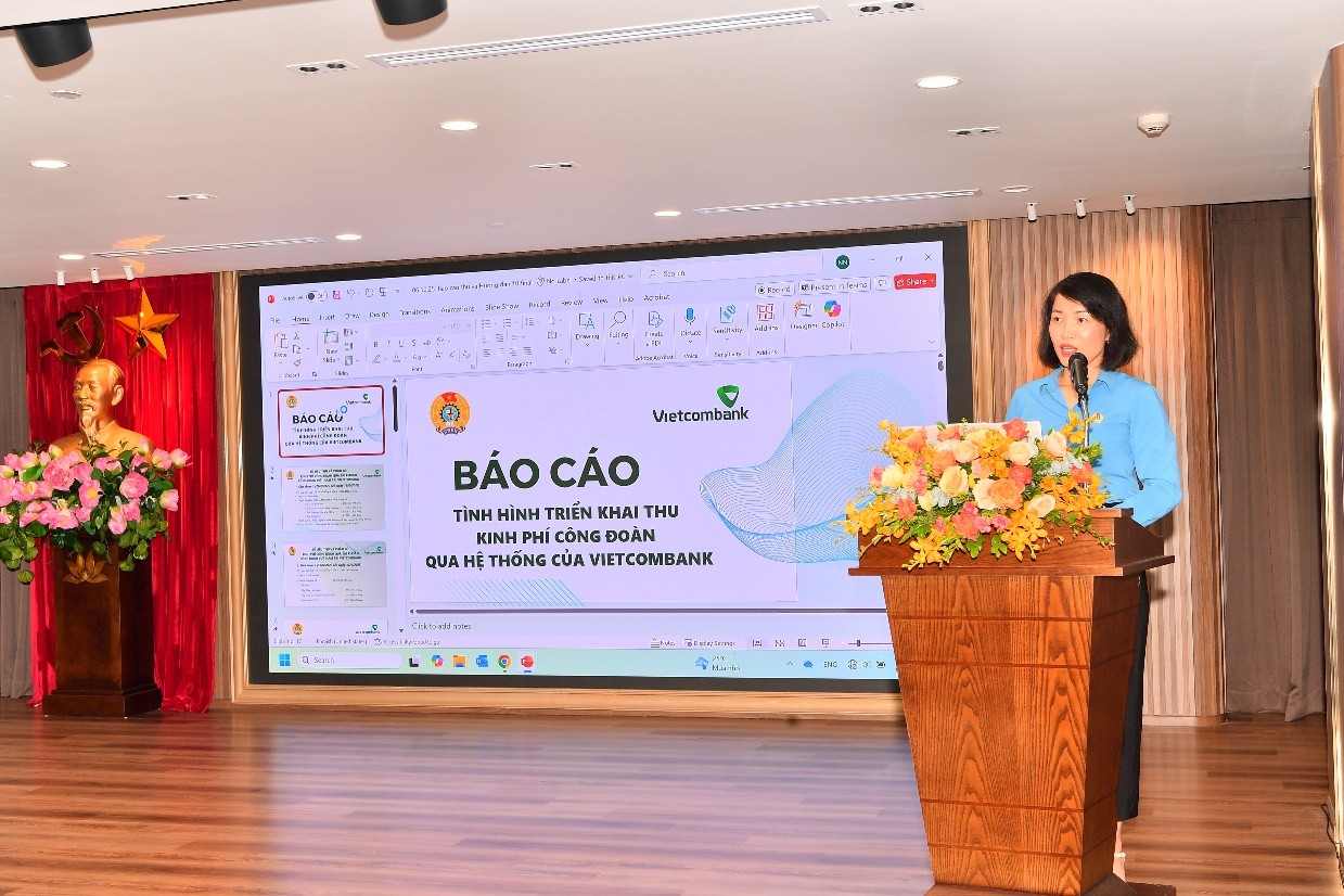 Hội nghị đã lắng nghe đại diện lãnh đạo Ban Công tác Công đoàn TLĐLĐVN hướng dẫn các bước triển khai thu KPCĐ qua tài khoản Công đoàn Việt Nam tại Vietcombank trên toàn quốc, và đại diện Vietcombank hướng dẫn cách thức nộp, theo dõi và báo cáo trên phần mềm thu KPCĐ của Vietcombank.