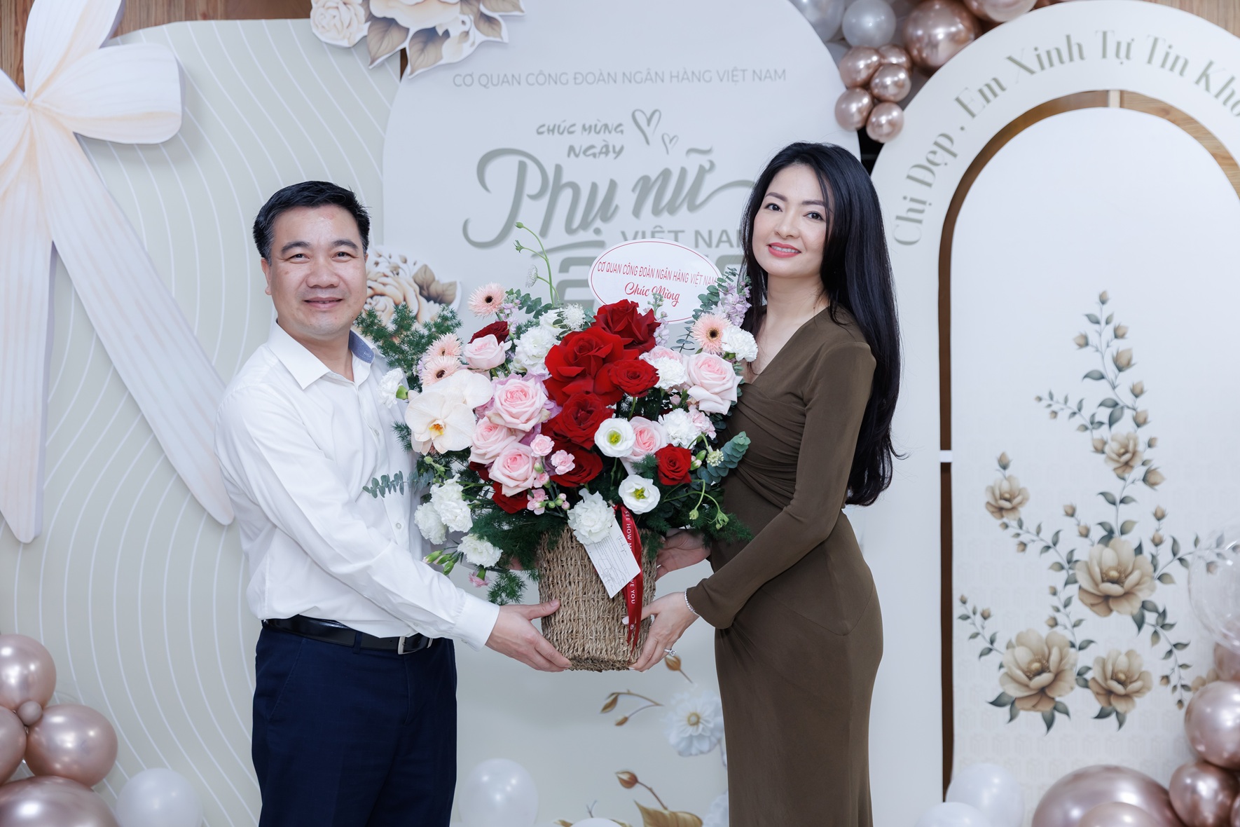 Đ/c Nguyễn Thành Trung - Chủ tịch Công đoàn Cơ quan tặng hoa chúc mừng đ/c Nguyễn Khánh Chi - Phó Chủ tịch Thường trực CĐNHVN