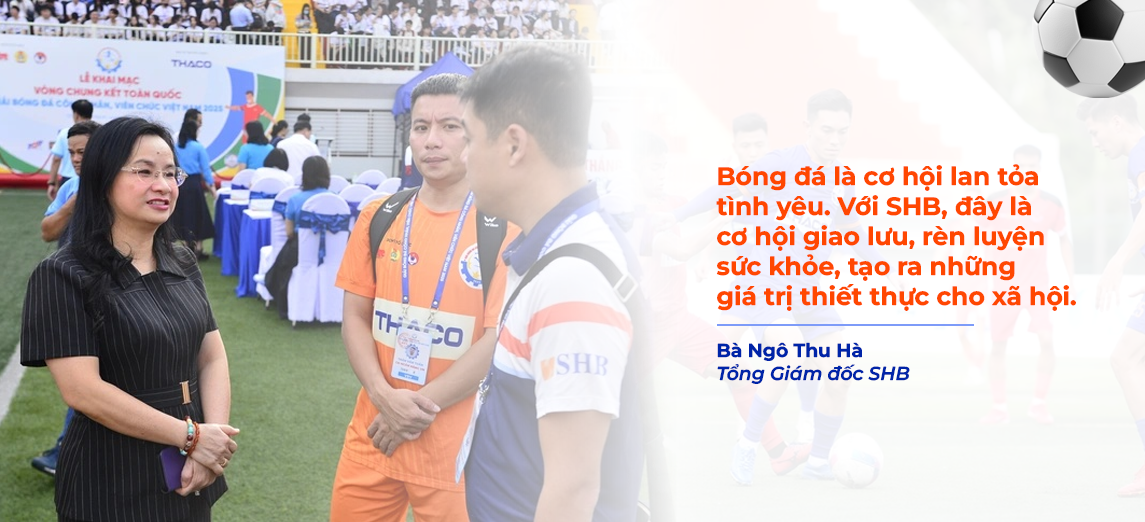 Trước khi bước vào các trận đấu quyết định, bà Ngô Thu Hà – Tổng Giám đốc SHB đã có mặt tại sân để động viên đội bóng. Chia sẻ với báo Tuổi Trẻ, bà khẳng định: “Bóng đá là cơ hội lan tỏa tình yêu. Với SHB, đây là cơ hội giao lưu, rèn luyện sức khỏe, tạo ra những giá trị thiết thực cho xã hội. Chúng tôi rất vinh dự được đại diện Công đoàn Ngân hàng tham gia giải đấu này.”
