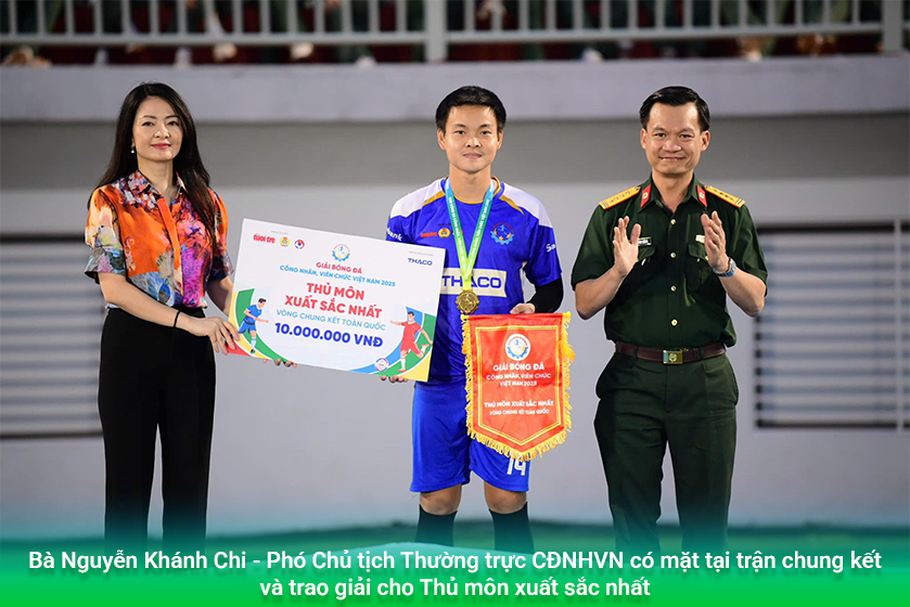 Không chỉ có sự đồng hành từ lãnh đạo doanh nghiệp, bà Nguyễn Khánh Chi – Phó Chủ tịch Thường trực Công đoàn Ngân hàng Việt Nam cũng trực tiếp có mặt tại lễ bế mạc và trao giải, kịp thời động viên các cầu thủ và chúc mừng tinh thần thi đấu của toàn đội. Sự hiện diện của lãnh đạo Công đoàn Ngành đã tiếp thêm nguồn động lực lớn cho đội bóng, thể hiện sự quan tâm sát sao và cam kết mạnh mẽ của Công đoàn Ngân hàng Việt Nam trong việc đồng hành, chăm lo đời sống tinh thần cho đoàn viên, người lao động.