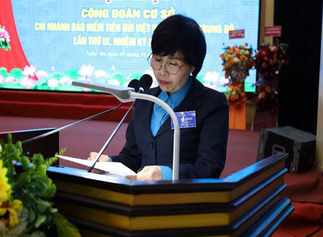 Phát biểu chỉ đạo Đại hội, đồng chí Châu Thị Xuân Hương - Phó Chủ tịch Thường trực Công đoàn BHTGVN biểu dương tinh thần đoàn kết, nỗ lực và kết quả đạt được của Công đoàn cơ sở Chi nhánh khu vực Bắc Trung Bộ trong nhiệm kỳ qua.