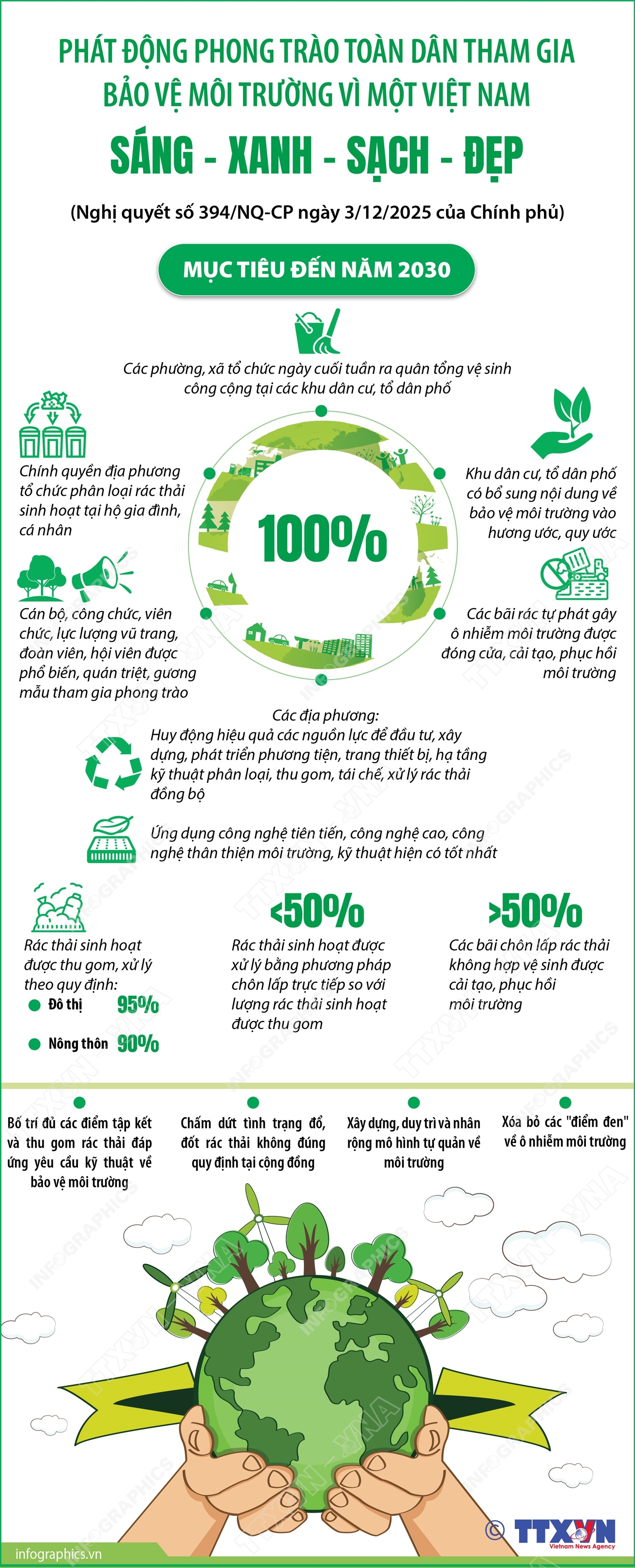 Theo đó, mục tiêu tổng quát của Nghị quyết là phát động phong trào Toàn dân tham gia bảo vệ môi trường trên phạm vi toàn quốc, đảm bảo tính thường xuyên, liên tục, rộng khắp và lan tỏa mạnh mẽ; hình thành nếp sống văn minh, thân thiện với môi trường trong cộng đồng dân cư, góp phần xây dựng môi trường sống sáng - xanh - sạch - đẹp tại Việt Nam.
